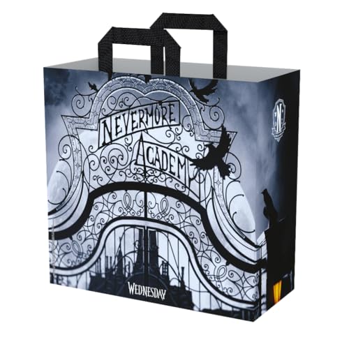Konix Mercredi Sac cabas - Taille M 40 x 45 x 20 cm - Matière recyclée - Motif Nevermore Academy - Noir et blanc