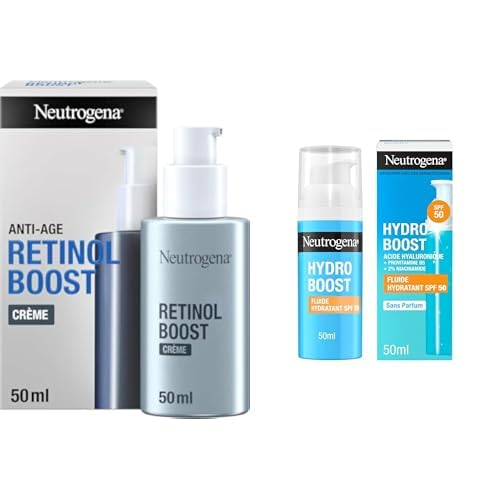 Neutrogena, Crème Anti-Âge Retinol Boost pour Combattre les Signes Visibles de l'Âge – enrichie en Rétinol + Fluide Hydratant Hydro Boost Spf 50 à L’Acide Hyaluronique, Provitamine B5 et Niacinamide