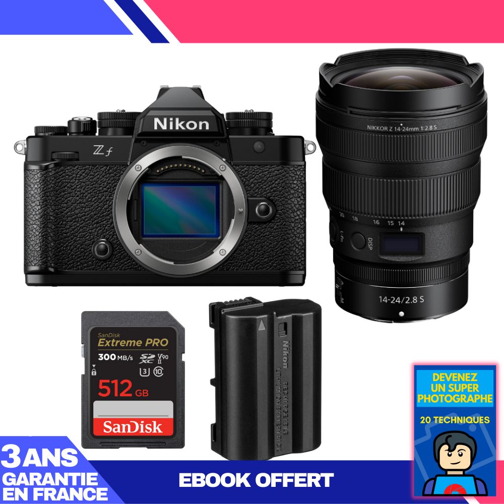 Boitier Nikon Zf + 14-24mm f/2.8 S + 1 SanDisk 512GB Extreme PRO UHS-II SDXC 300 MB/s + 1 Nikon EN-EL15C + Ebook 'Devenez Un Super Photographe
