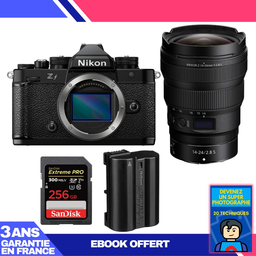Boitier Nikon Zf + 14-24mm f/2.8 S + 1 SanDisk 256GB Extreme PRO UHS-II SDXC 300 MB/s + 1 Nikon EN-EL15C + Ebook 'Devenez Un Super Photographe