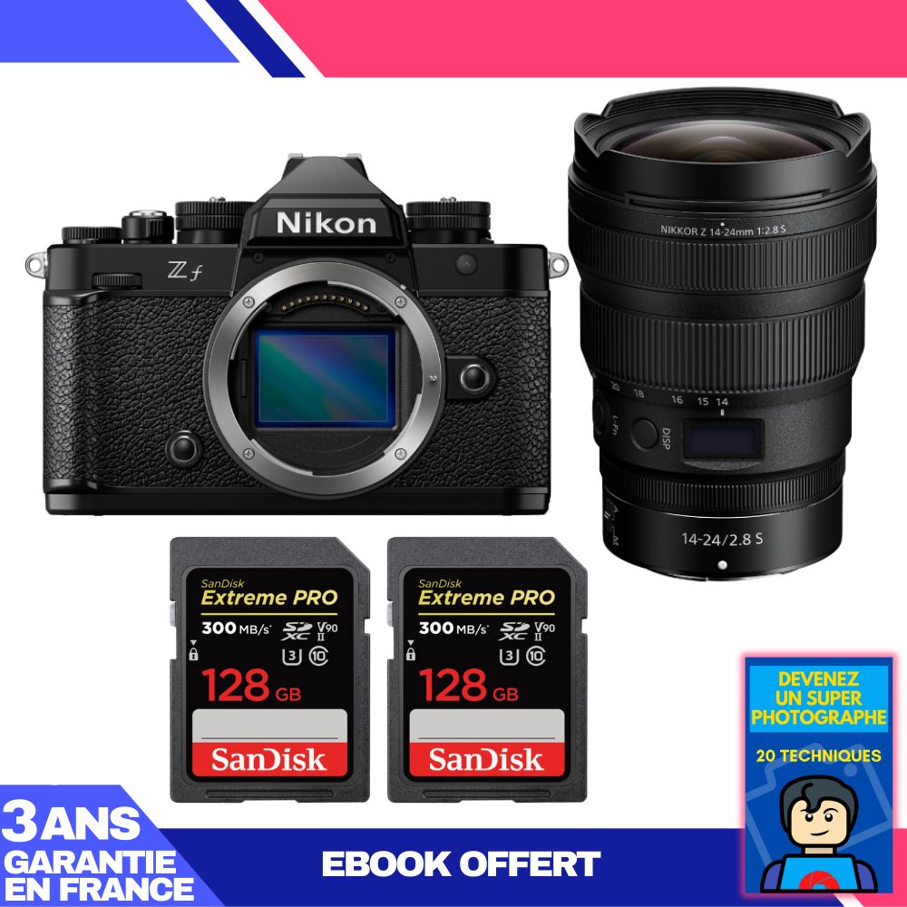 Boitier Nikon Zf + 14-24mm f/2.8 S + 2 SanDisk 128GB Extreme PRO UHS-II SDXC 300 MB/s + Ebook 'Devenez Un Super Photographe