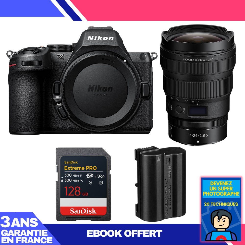 Boitier Nikon Z5 II + 14-24mm f/2.8 S + 3 SanDisk 128GB Extreme PRO UHS-II SDXC + Nikon EN-EL15c + Ebook 'Devenez Un Super Photographe