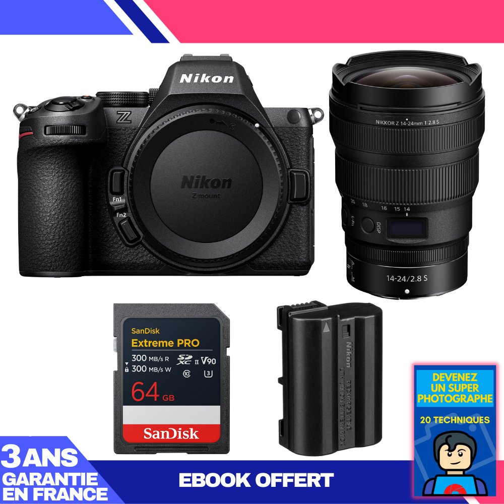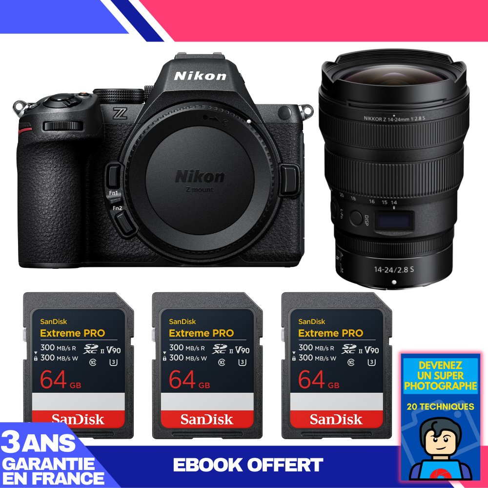 Boitier Nikon Z5 II + 14-24mm f/2.8 S + 3 SanDisk 64GB Extreme PRO UHS-II SDXC + Nikon EN-EL15c + Ebook 'Devenez Un Super Photographe