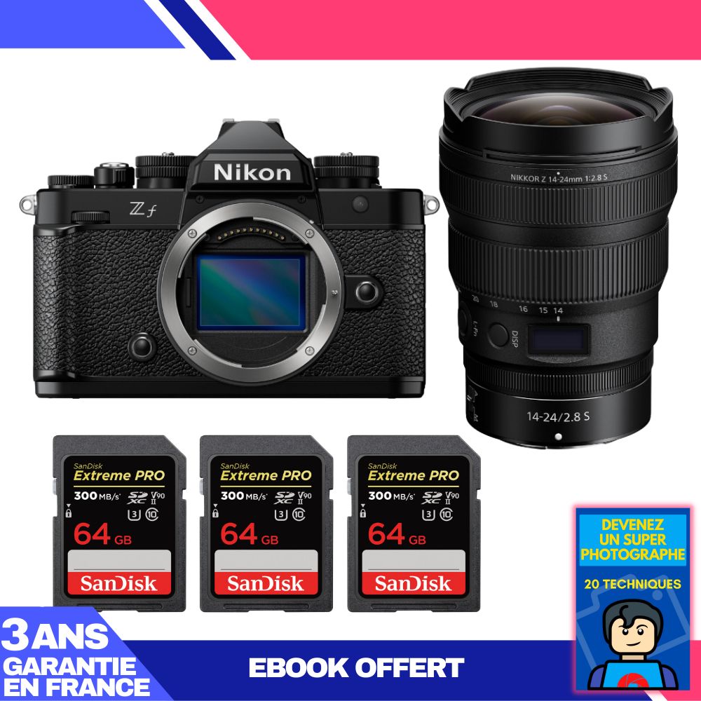 Boitier Nikon Zf + 14-24mm f/2.8 S + 3 SanDisk 64GB Extreme PRO UHS-II SDXC 300 MB/s + Ebook 'Devenez Un Super Photographe