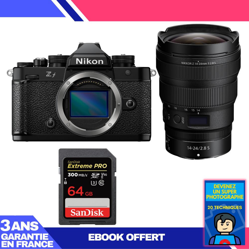 Boitier Nikon Zf + 14-24mm f/2.8 S + 2 SanDisk 64GB Extreme PRO UHS-II SDXC 300 MB/s + Ebook 'Devenez Un Super Photographe