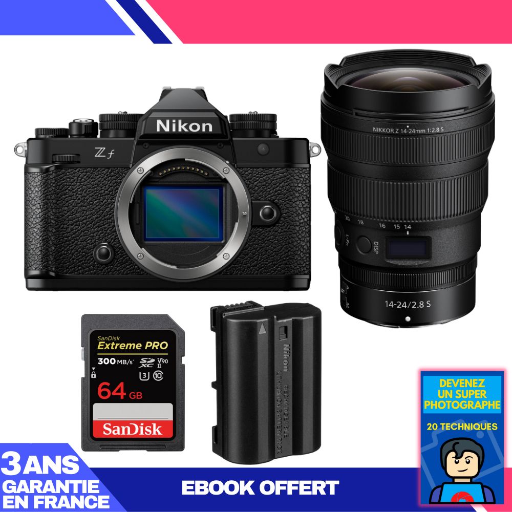 Boitier Nikon Zf + 14-24mm f/2.8 S + 1 SanDisk 64GB Extreme PRO UHS-II SDXC 300 MB/s + 1 Nikon EN-EL15C + Ebook 'Devenez Un Super Photographe
