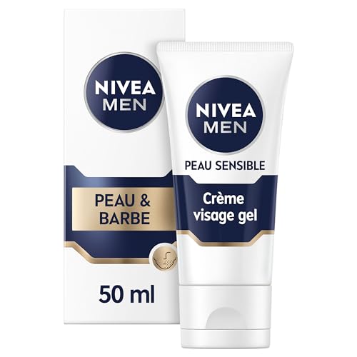 NIVEA MEN Crème Visage Gel Peau & Barbe pour peaux sensibles (1 x 50 ml), crème visage hydratante homme 0% alcool, soin barbe homme apaisant à la peau sensible et irritée