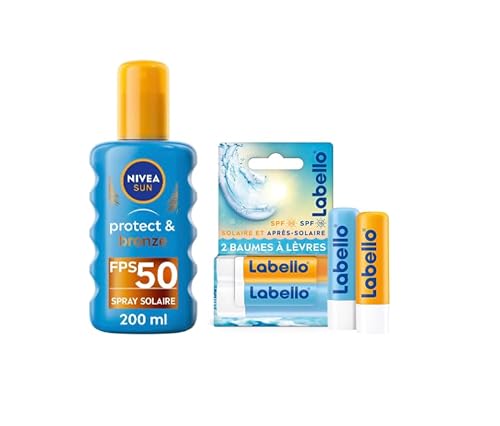 NIVEA SUN Spray protection solaire Protect & Bronze FPS 50 activateur de bronzage (1x200 ml) & LABELLO Sun Protect FPS30 & Hydro Care FPS15 (2x5,5 ml), baume à lèvres enrichis en vitamines C & E