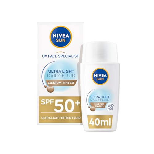NIVEA SUN - Fluide Teinté UV Quotidien FPS 50+ - Protection Solaire Visage - Hydrate & Unifie Le Teint - Acide Hyaluronique - Formule Ultra-Légère - Tous Types De Peaux - Teinte : Medium - 40 ml