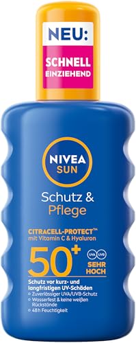 NIVEA SUN Spray solaire de protection et de soin SPF 50+, imperméable, à la vitamine C et à l'acide hyaluronique, protection solaire à absorption rapide pour 48 h d'humidité (200 ml)