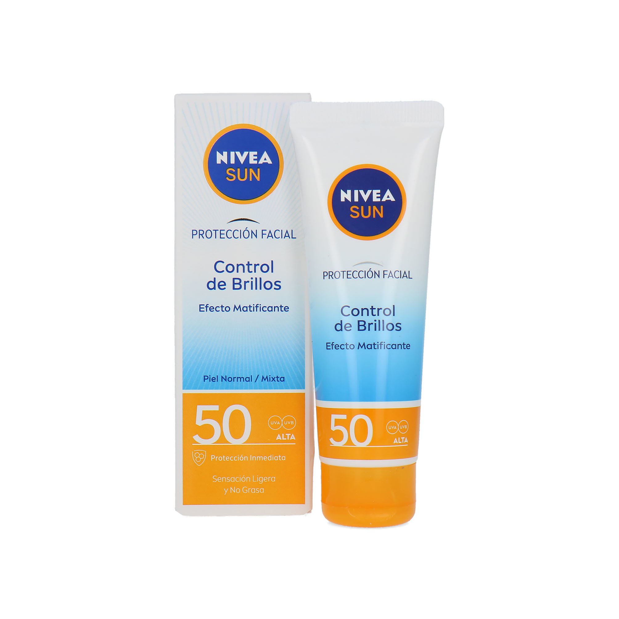 NIVEA SUN - Crème UV Visage Anti-Brillance Teintée FPS 50 - Protection UVA/UVB - Hydrate, Protège & Matifie - Antioxydant - Sans Silicone - Non Collant - Peaux Normales À Mixtes - Medium - 50 ml