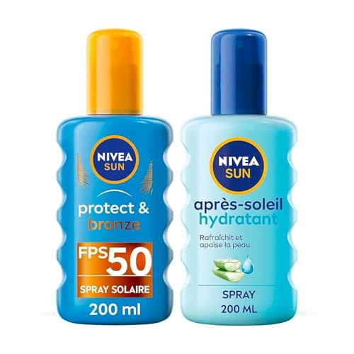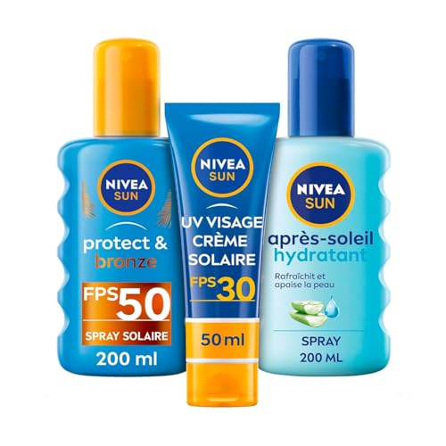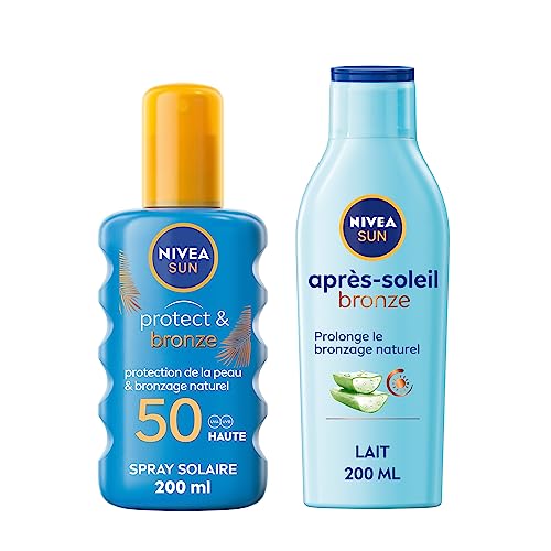 NIVEA SUN Routine bronzage & haute protection solaire avec spray solaire Protect & Bronze FPS 50 et après-soleil hydratant, Protection anti UV pour tous types de peau