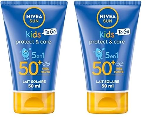 NIVEA SUN Lait solaire Protect & Play Enfants FPS 50+ Format voyage (1 x 50 ml), Crème solaire résistante à l’eau, Protection solaire formulée pour la peau des enfants (Lot de 2)