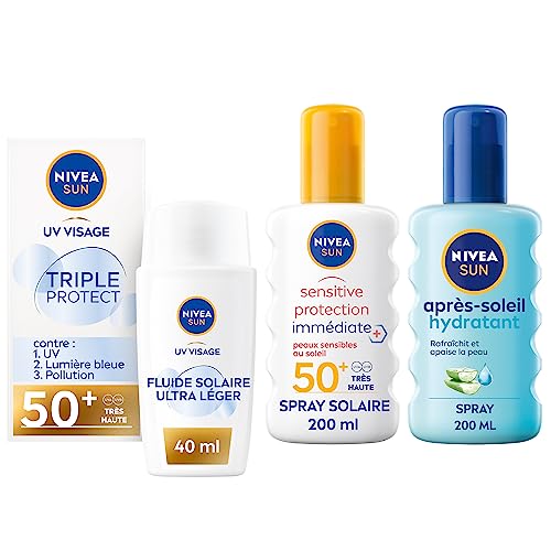 NIVEA SUN Routine solaire avec fluide solaire UV Visage FPS 50+, spray solaire protection immédiate FPS 50+ et après-soleil hydratant, Protection solaire pour tous types de peau