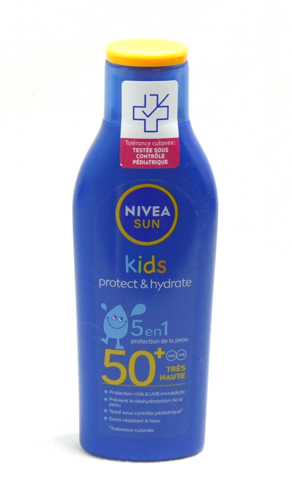 NIVEA SUN Lait Solaire Protect & Hydrate Kids SPF 50+ 200 ml — Crème Solaire résistante à l'eau — Haute Protection Visage et Corps pour la peau délicate des Enfants (Lot de 2)