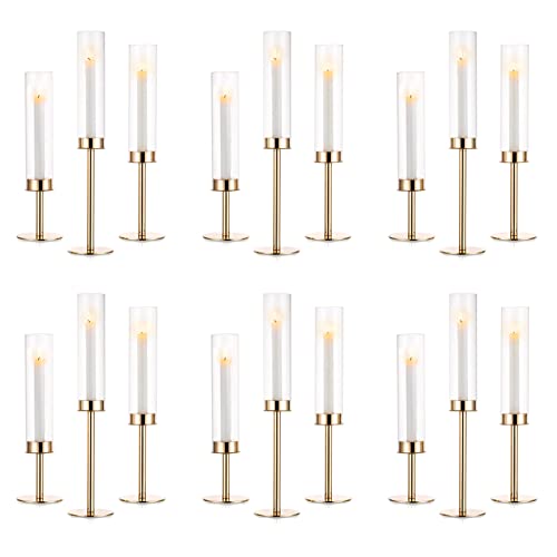 Nuptio Chandelier Ouragan Métal Or - 18 Pièces Chandeliers À Bougies Coniques Pack Supports, Abat-Jour Ouragan Verre Transparent Bougies Coniques Modernes Mariage Table Noël Dîner Cheminée