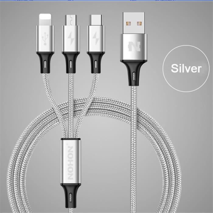 3 en 1 Câble Micro USB Type C 8Pin pour iPhone 8 7 6 6S Plus iOS 10 9 8 Samsung Nokia USB câbles de charge rapide cordon| argent