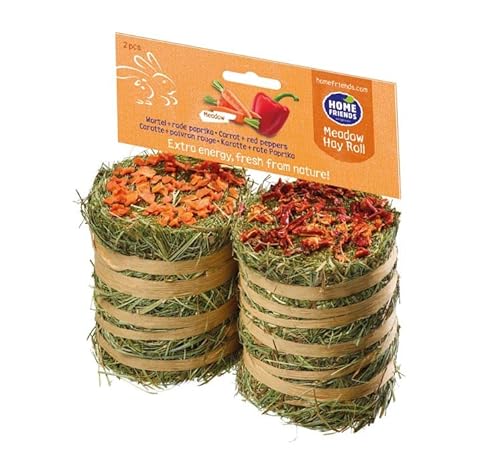 Homefriends Lot de 2 Rouleaux de Foin avec Carotte et poivron pour Lapins, Nains, Hamsters, cochons d'Inde et rongeurs (2 unités - 200 g) - Nourriture pour Lapins avec Fibres pour l'usure Dentaire du