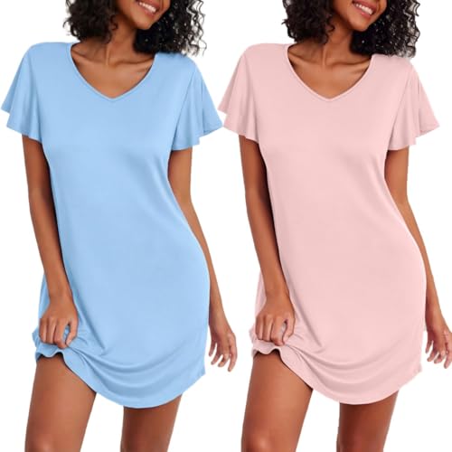 Ekouaer Chemises de Nuit à Manches Courtes pour Femmes 4 pièces Chemise de Nuit Mignonne d'été Ourson Rose + Bleu XXL