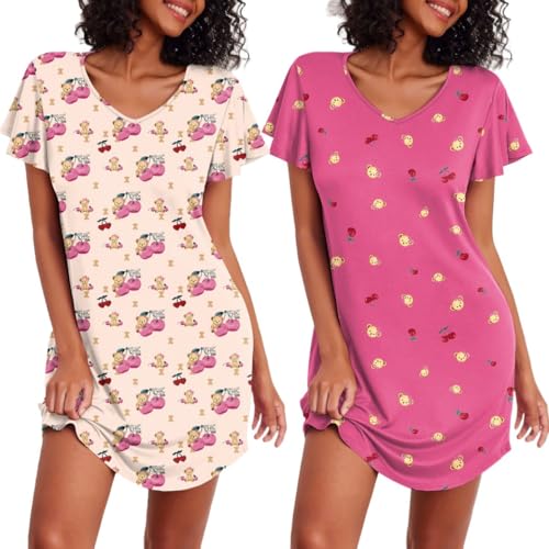Ekouaer Chemises de Nuit à Manches Courtes pour Femmes 2 pièces Chemise de Nuit Mignonne d'été Kaki Ourson Doughnut +Cerise L