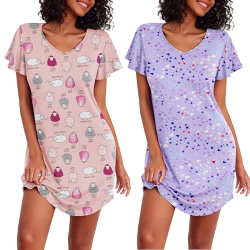 Ekouaer Chemises de Nuit à Manches Courtes pour Femmes 2 pièces Chemise de Nuit Mignonne d'été étoiles + Mouton XXL
