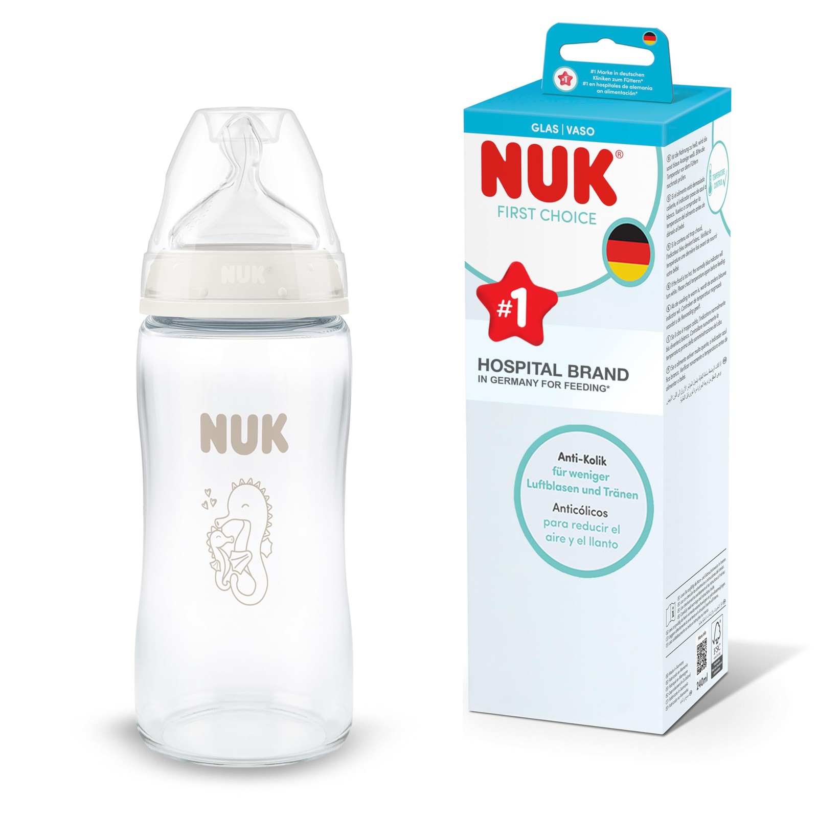 NUK First Choice Biberon | 0+ mois | 240 ml | Biberon anti-colique | Verre | Indicateur de contrôle de la température | Hippocampe | Lot de 1