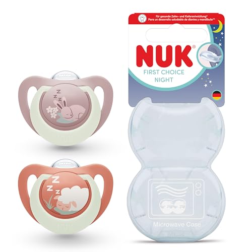 NUK First Choice Night Sucettes pour bébé | 6-18 mois | Sucettes orthodontiques phosphorescentes | Apaise 99% des bébés** | Lapin/Mouton | Lot de 2