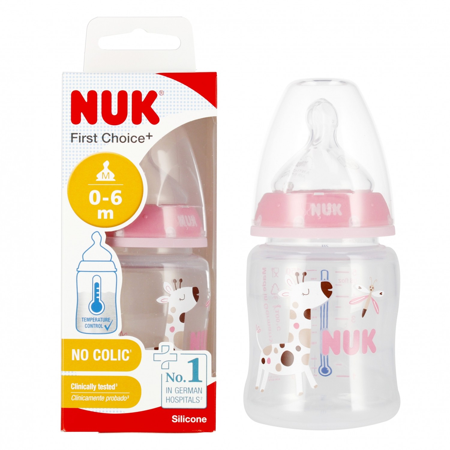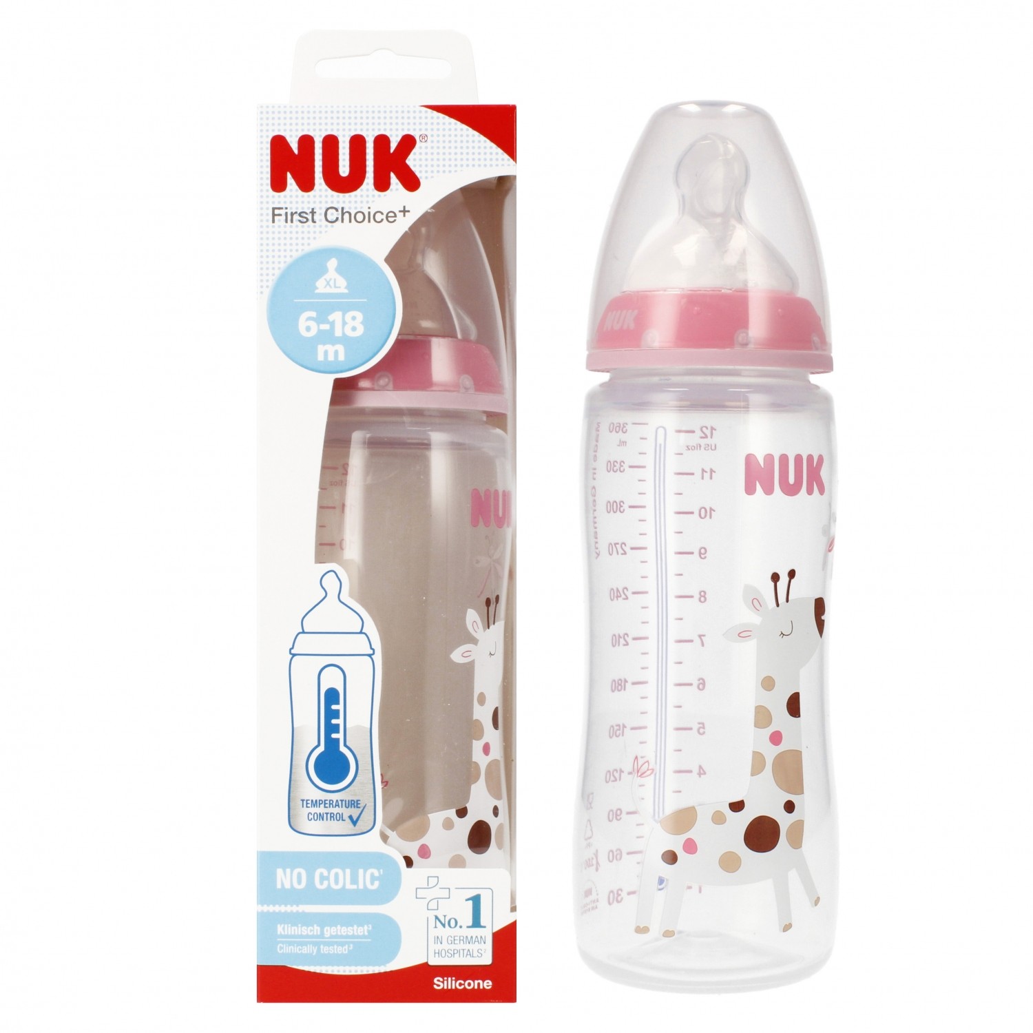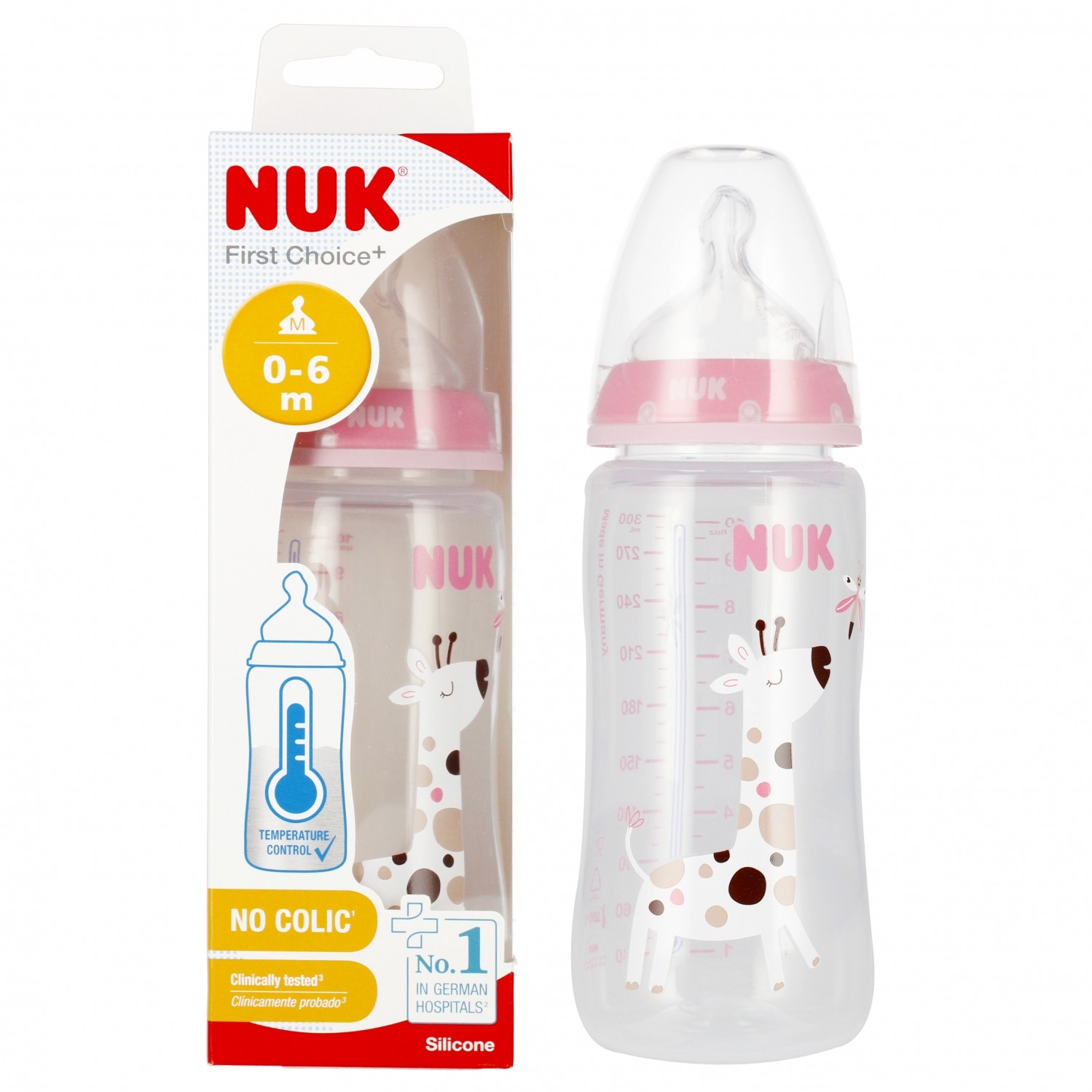 Nuk First Choice+ Lot de 3 biberons pour bébé de 0 à 6 mois, contrôle de la température, anti-coliques, 300 ml, sans BPA, tétine en silicone, motif girafe rose 10225265