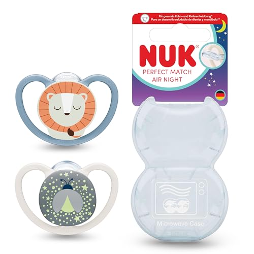 NUK Perfect Match Air Night Sucettes | 6-18 mois | Sucettes phosphorescentes orthodontiques favorisant l’aération et prévenant l’irritation | 95% d’acceptation par les bébés** | Lion | 2 unités