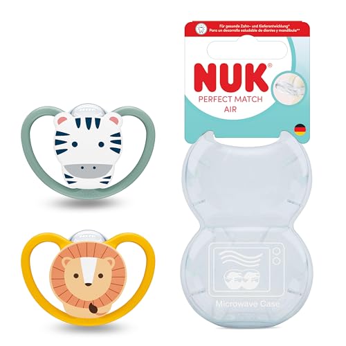 NUK Perfect Match Air Sucettes pour bébé | 6-18 mois | Sucettes orthodontiques favorisant l’aération et prévenant l’irritation | 95% d’acceptation par les bébés** | Zèbre/Lion | 2 unités