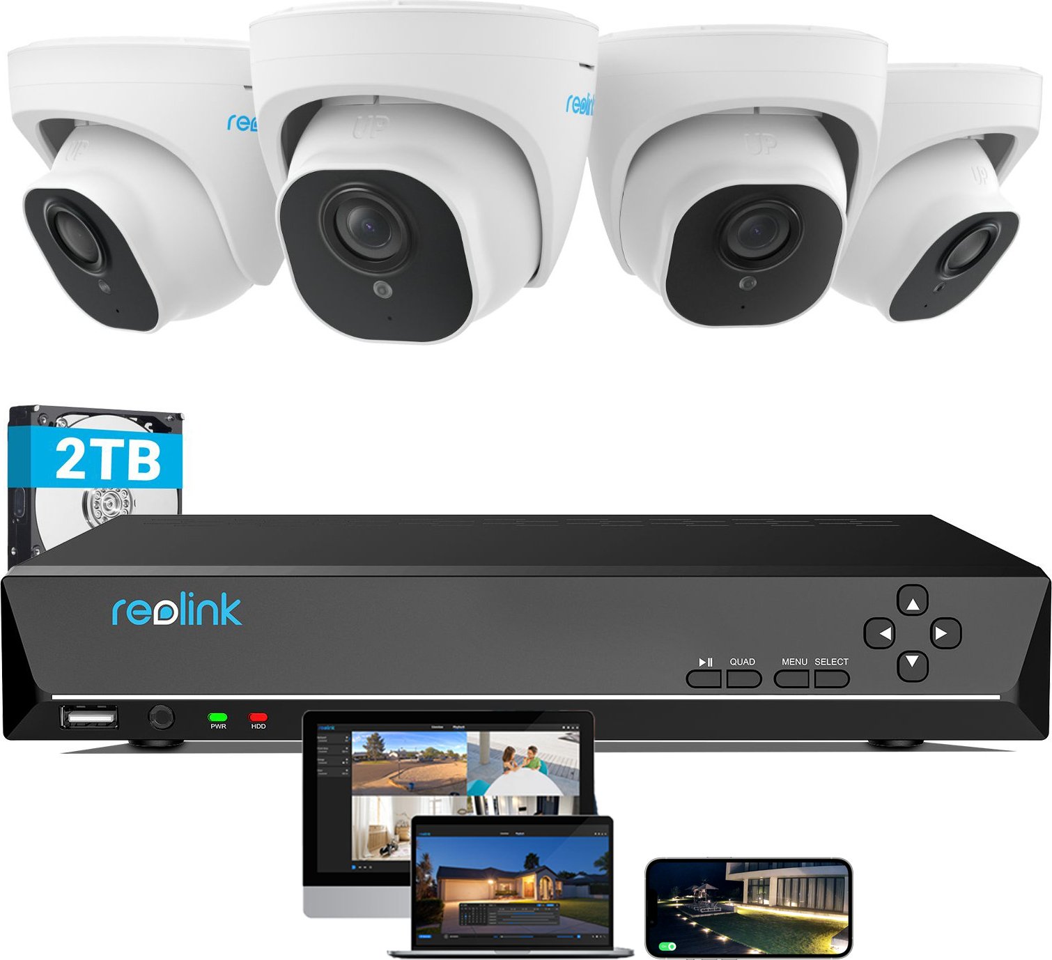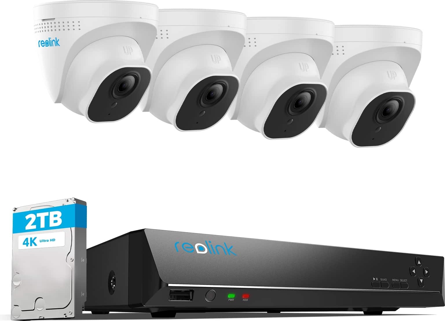 Reolink Caméra de surveillance 4K Set extérieur, 8CH surveillance vidéo avec 4X 8MP PoE caméra IP et 2TB HDD NVR pour l'enregistrement 24/7 intérieur extérieur, détection de personnes et de véhicules, IP66, RLK8-800D4-A