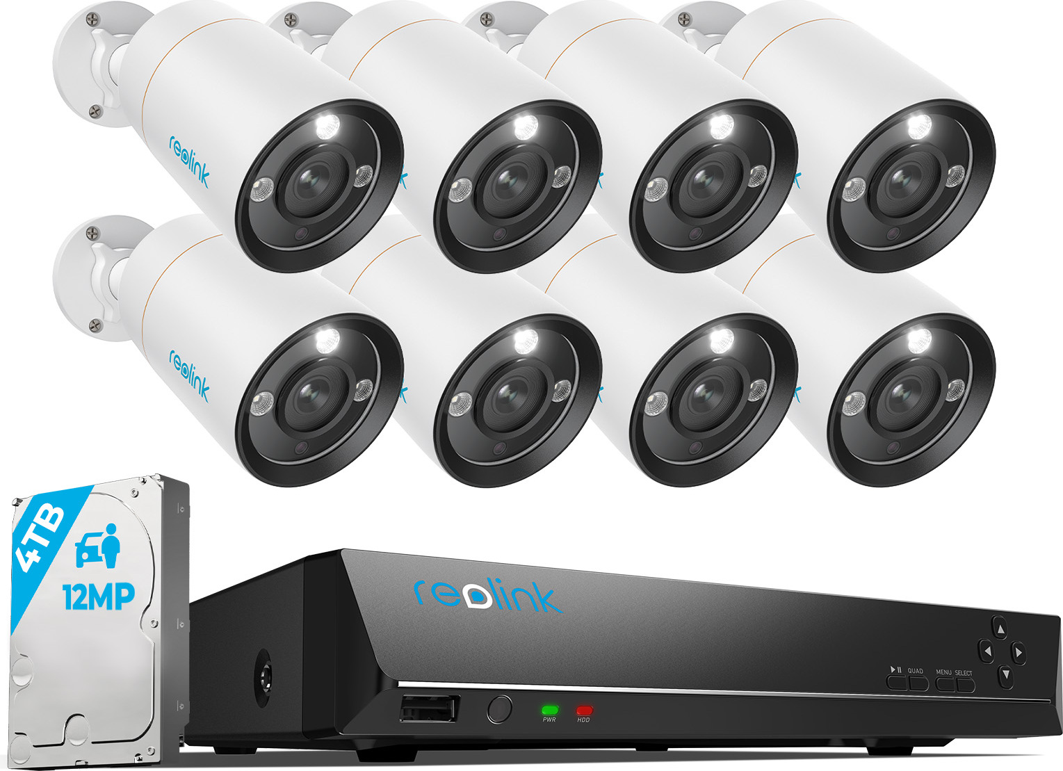 Reolink RLK8-1200D4-A, Système de surveillance PoE 12MP extérieur, 8CH 2TB HDD NVR & 4X PoE Caméra de surveillance, Enregistrement 24/7, Spotlight, Détection intelligente