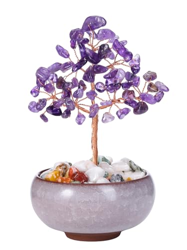 Jovivi Arbre de Vie Améthyste Pierre Naturelle Gemme Feng Shui Figurine avec Base Bol de Céramique Guérison Reiki Cristaux Équilibre Bibelot Objet Décoration Ornement pour Bureau Chambre (Améthyste)