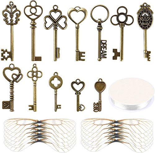SANNIX 48 Pièces Clés Squelette en Bronze Clés Vintage Decoration Volantes Charmes avec 50 Paires d'ailes de Libellule et Cordon élastique en Cristal de 30 m pour Décoration de Chambre