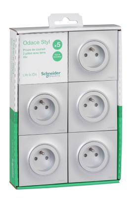 Prise avec terre complète Schneider Electric Odace aluminium, lot de 5