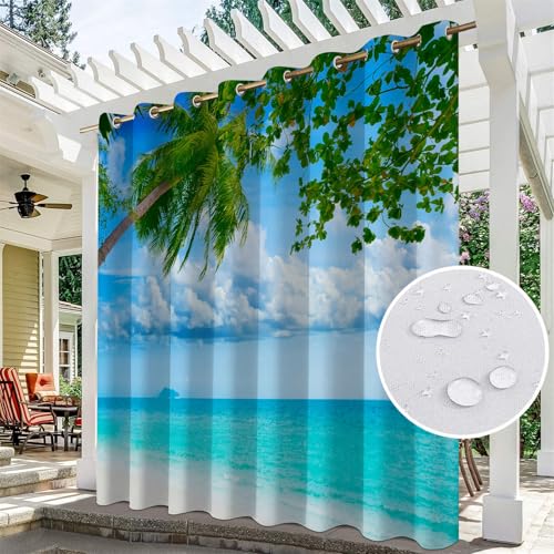 Hiseng Rideaux Extérieur Imperméable, Motif Vue Mer 3D Rideau Occultant Isolant Thermique Rideau d'Extérieur avec Oeillet Rideau pour Pergola 1 Pièce Rideau Terrasse (264x213cm,Vue Mer)