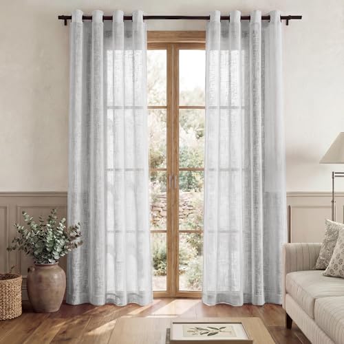 PONY DANCE Rideau Voilage - Voilage Blanc Transparent Panneaux Voile en Effet Lin Texturé Décoration de Fenêtre avec Oeillet pour Cuisine Chambre, Chaque: L132xH158cm, Blanc, Lot de 2