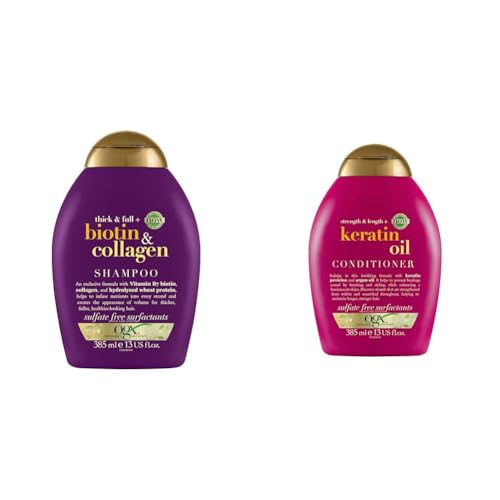 OGX Shampoing Sans Sulfate à la Biotine et au Collagène pour Épaissir les Cheveux, 385 ml & Après-Shampoing à l'Huile de Keratine pour Réparer Les Pointes Fourchues, 385 ml