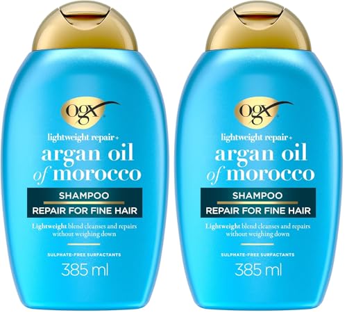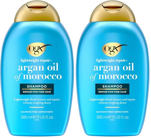 OGX Shampooing Weightless Hydration + Argan Oil of Morocco (bouteille de 385 ml) – Shampoing léger pour ne pas alourdir les cheveux – Soin cheveux hydratant sans sulfate (Lot de 2)
