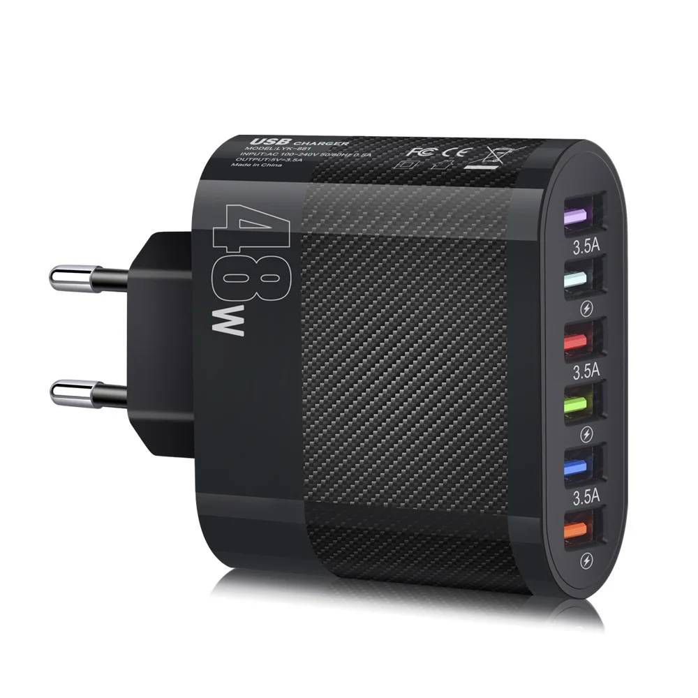 Adaptateur de téléphone portable à charge rapide USB, chargeur de type C pour iPhone 14, 13 Pro, Xiaomi, Samsung, Oneplus, charge murale QC 3.5, 6 ports, 48W EU Black