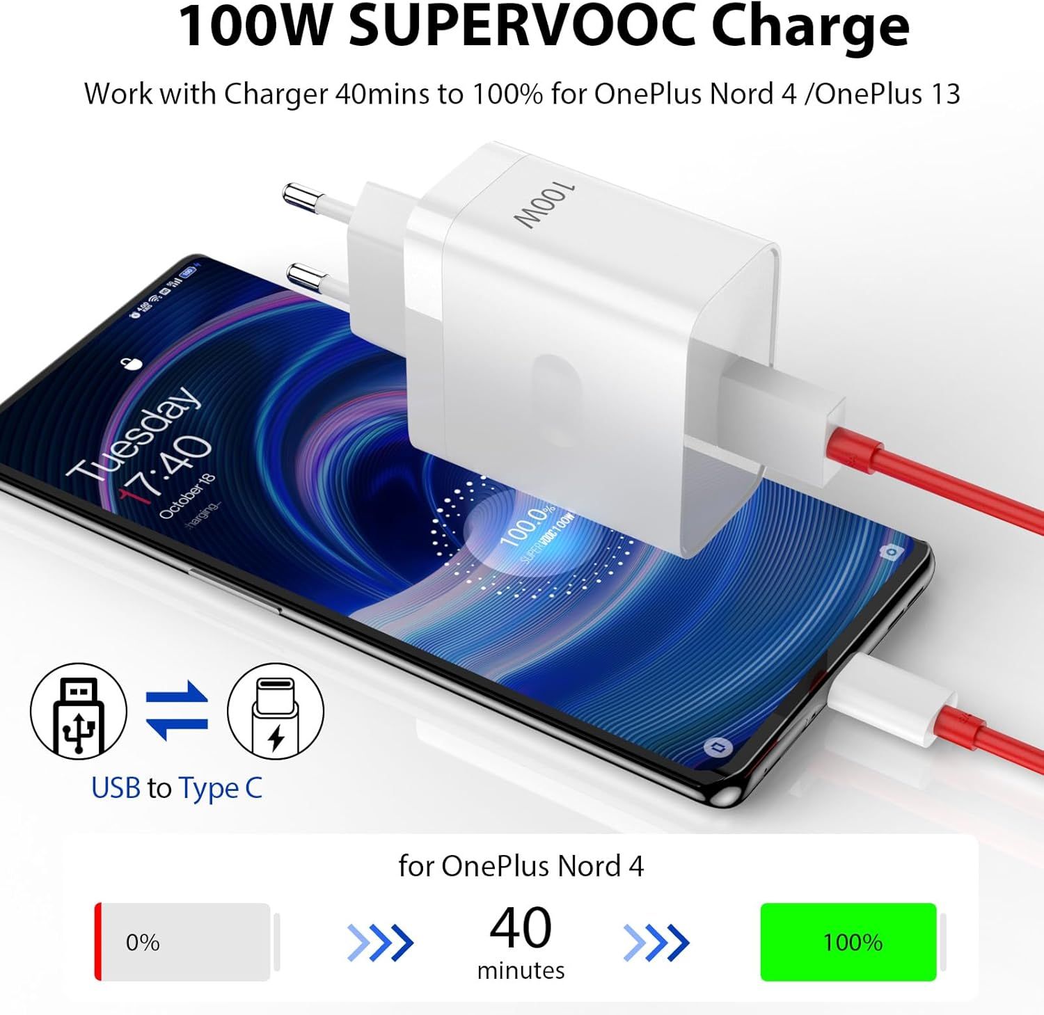 100W Super VOOC Chargeur et 8A Câble USB C 1m pour OnePlus 13/12R/11,USB C Chargeur Secteur Chargeur Rapide pour OnePlus Nord 4 3 2 CE 4 3 Lite 10T 9 Oppo Find X8 Pro Reno 14 13F 12FS 11F A80 A40