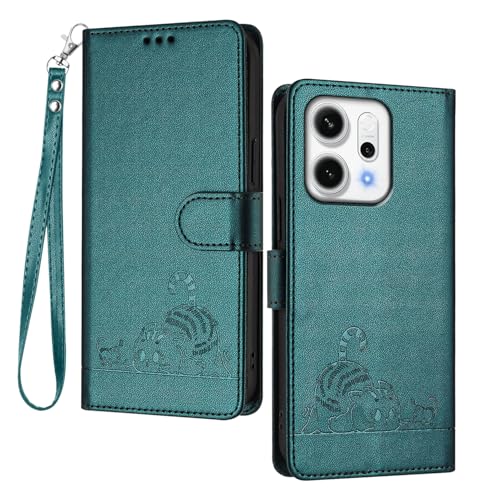GOGME Coque pour Oppo Reno 14 (Reno14) 5G - Chat Mignon Embossé en Cuir Portefeuille Antichoc Étui Housse avec Emplacements pour Cartes/Blocage RFID/Fonction Support, Vert Foncé