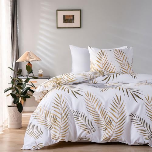 Gezu Housse de Couette 140x200cm Doré Motif Feuilles de Palmier Tropicales Or et Blanc Parure de Lit Botanique Linge de Lit Moderne Doux Respirant avec Fermeture Éclair et 2 Taies d'oreiller 65x65