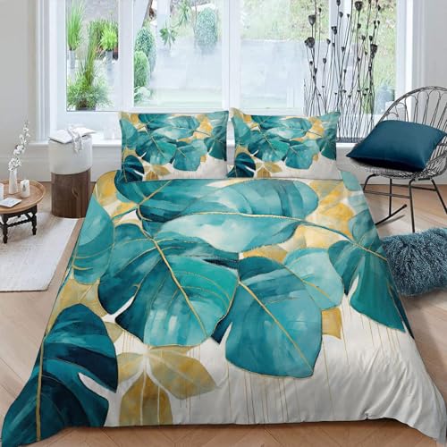 Or Parure de Lit 140 x 200 Feuilles Tropicales Feuilles de Palmier Housse de Couette Imprimé Microfibre Confortable Ensemble de Literie avec Fermeture Éclair et 2 Taies d'oreiller pour Garçon Fille
