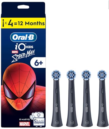 Oral-B iO Kids 6+ Lot de 4 têtes de brosse à dents électrique, motif Marvel Spiderman, pour enfants à partir de 6 ans, douces pour les dents et les gencives, noires