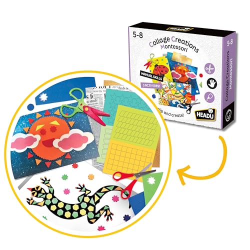 Headu - Collage Creation Montessori - Coupe, Découpe Et Crée ! | Jeu Educatif 4 5 6 7 8 Ans, Jeu Educatif Montessori, Kit Créatif pour Enfants, Cadeau Fille, Cadeau Garçon, Made in Italy