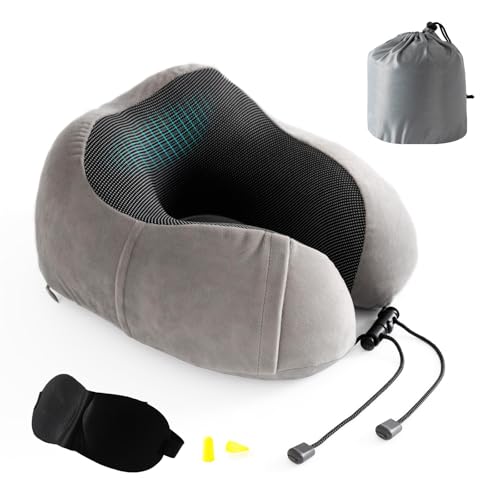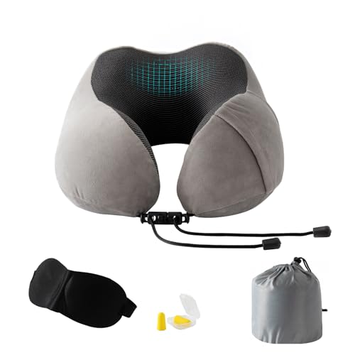 Good Nite Oreiller de Voyage,Oreiller Cervical,Mousse à mémoire Coussin de Voyage,Voyages en Avion et en Train, Sac de Transport Inclus Masque pour Les Yeux Bouchons d'oreille Gris