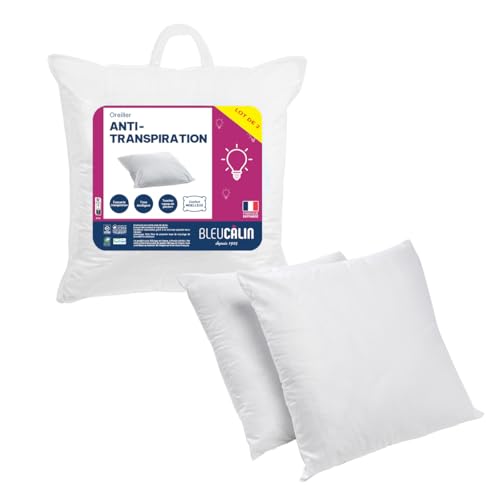 Bleu Calin Lot de 2 Oreillers Moelleux 60x60 cm Anti-transpiration, Microfibre Respirante Topcool, Labelisés Oeko-tex, Fabriqués en France