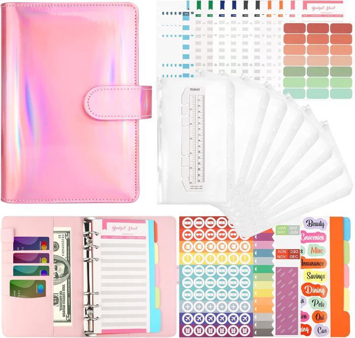 Classeur Budget A6 Budget Planner Classeur Enveloppe Budget Set Cuir PU Laser Organisateur Budget avec 8 Pochettes Depenses