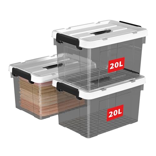 Cetomo 20L*3 Boîte de Rangement, Bac de rangement avec Poignée, Plastique Organisateur avec Couvercle, Empilable, Transportable, pour Vêtements, Bureau, Dortoirs, Transparent Noir, 20L - Lot de 3